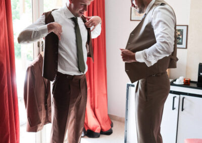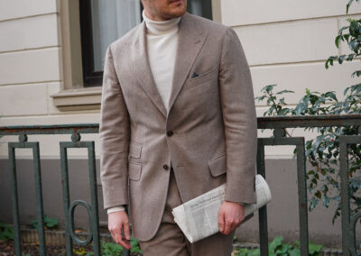 Die Fertigung erfolgt in spezialisierten Manufakturen, die für exzellente Handwerkskunst stehen und jedes Kleidungsstück mit größter Sorgfalt umsetzen. Rund vier bis sechs Wochen später findet die finale Anprobe statt – selbstverständlich wieder bei Ihnen vor Ort. Erst wenn Passform, Proportionen und Gesamtbild stimmig sind und Ihren Anspruch widerspiegeln, ist meine Arbeit abgeschlossen.